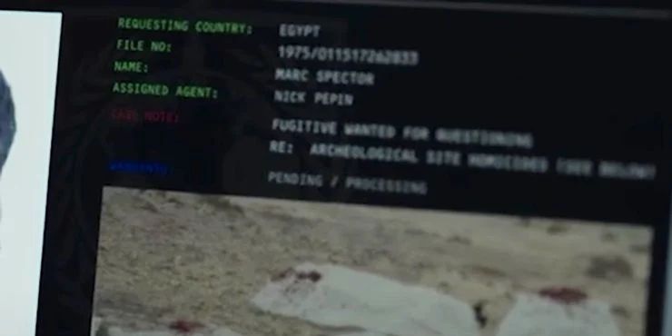 在去与亚瑟·哈罗会面的路上,芭比调出了马克·斯派特在国际刑警组织的档案,显示了他的大量暴力犯罪名单。马克的个人主页也提供了两个漫威彩蛋。首先,案件的档案编号是1975年,那一年月亮骑士在《狼人之夜#32》中首次亮相。其次,“指定代理”显示是“尼克·佩平”,这是为了纪念一位长期效力于漫威的同名制片人。佩平从《美国队长3:内战》开始就一直为漫威工作,他也在《月亮骑士》中担任“制作和开发经理”。
