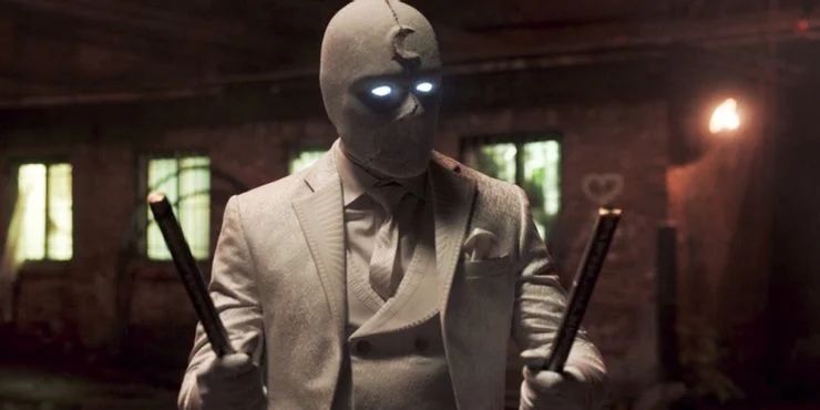 《月亮骑士》第一集已经展示了主角的月亮骑士标准战斗套装,其设计与漫画原著也非常相似,但第二集透露了更多信息。当史蒂文·格兰特代替马克·斯佩克特“召唤战斗服”时,显现出来的却变成了一套白色的燕尾服,整个头部都戴着曼哈顿医生式的面具。这个设计的灵感来自漫威2014年的《骑士先生》,在他与豺狼战斗中,月亮骑士挥舞着警棍和月亮形状的刀片。这两种武器都可以在原始材料中找到,刀片是用亚德曼合金制作的,与金刚狼的金属爪相同。不知道月亮骑士的武器能不能让x战警离漫威电影宇宙的首次亮相更近一步。