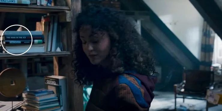当史蒂文·格兰特带着这位意外冒出来的妻子回到公寓(注意,这一集解释了这是他母亲的公寓,这也解释了上一集提到的疑问,他是如何负担得起的)时,蕾拉很欣赏史蒂文收藏了这么大量的书,她似乎从来没有意识到她的丈夫是如此博学。当她站在一个书架旁边,右肩上的一本书的书脊上写着“冰中的人”。《冰中的人》是康拉德·斯平德勒所著的一本真正的考古学著作。然而,在漫威电影宇宙中,“冰中的人”只能对应着一个人,那就是美国队长。因为与史蒂夫·罗杰斯的默契联系,《月亮骑士》第二集故意突出了这个特殊的头衔,简直让人难以置信。